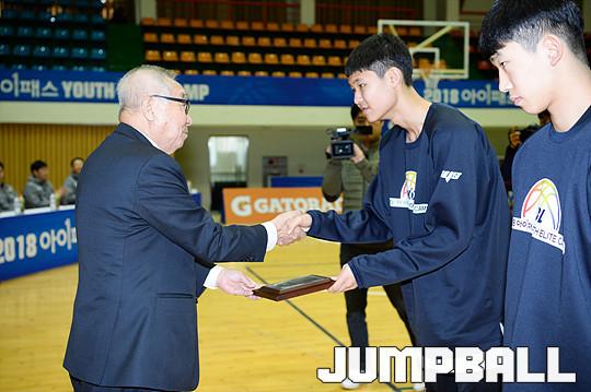 25일 속초시청소년수련관에서 열린 ‘2018 아이패스 YOUTH ELITE CAMP’ KBL 김영기 총재가 참가 선수 대표에게 기념패를 전달하고 있다.