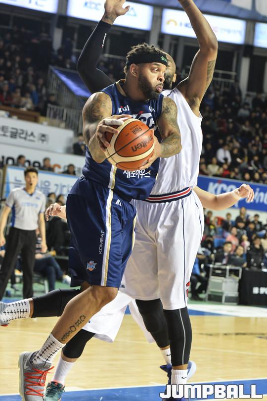 [점프볼=전주/홍기웅 기자] 25일 전주실내체육관에서 열린 '2017-2018 정관장 프로농구' 전주 KCC와 울산 현대모비스의 경기. KCC 안드레 에밋이 골밑으로 돌파후 오픈인 외곽에 패스를 건네고 있다.
