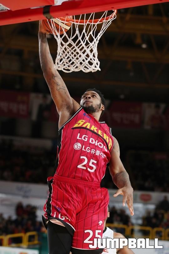 [점프볼=창원/김병문 기자] 25일 창원실내체육관에서 열린 정관장프로농구 KBL2017-2018 시즌 창원 LG 안양 KGC의 경기, LG 제임스 켈리가 덩크슛을 넣고 있다.