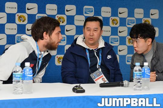 22일 잠실실내체육관 미디어컨퍼런스에서 열린 '2019 FIBA 농구 월드컵 아시아-오세아니아 예선전' 한국-홍콩전 기자회견. 홍콩 감독과 덩컨리드가 기자의 질문에 통역을 듣고 있다.