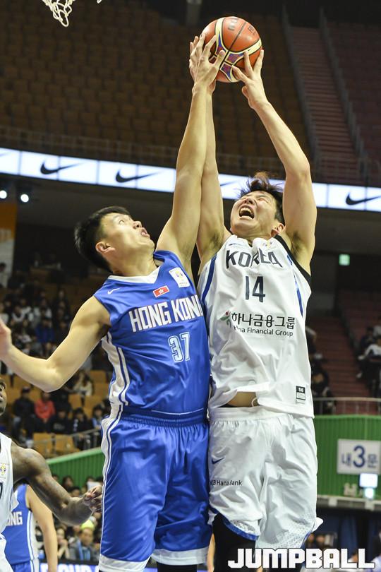 [점프볼=잠실/홍기웅 기자] 23일 잠실실내체육관에서 열린 '2019 FIBA 농구 월드컵 아시아 예선전' 대한민국-홍콩전. 최부경이 블록 슛을 당하지만 그대로 골밑 슛을 올리고 있다.