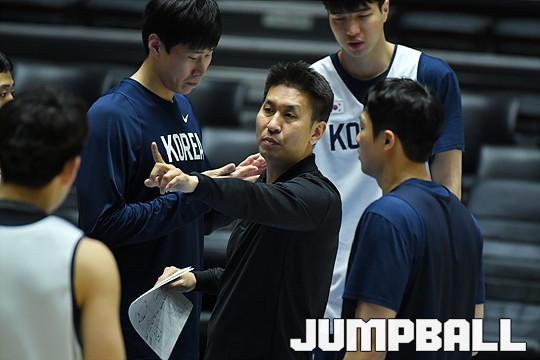 [점프볼=잠실/유용우 기자] 25일 잠실실내체육관에서 남자농구대표팀이 '2019 FIBA 농구 월드컵 아시아-오세아니아 예선전' 뉴질랜드와의 경기를 앞두고 전술훈련을 실시하고 있다. 대표팀 김상식 코치가 선수들을 지도하고 있다.