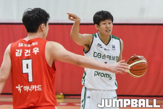 [점프볼=고양/홍기웅 기자] 26일 고양체육관내 보조체육관에서 열린 '2017-2018 KBL D리그' 서울 SK와 원주 DB의 D리그 2차 결승 경기. DB 한정원이 팀원에게 위치 선정을 하고 있다.