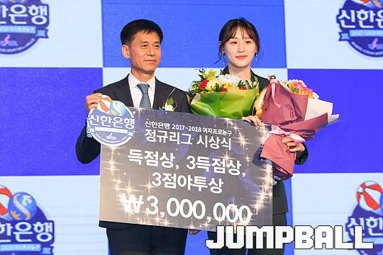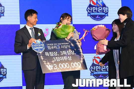 [점프볼=더케이호텔/유용우 기자] 2017-2018 여자프로농구(WKBL) 정규리그 시상식이 8일 서울 서초구 양재동 더케이호텔 그랜드볼룸에서 개최됐다. KEB하나은행 강이슬이 득점상, 3득점상, 3점야투상을 수상하고 있다.