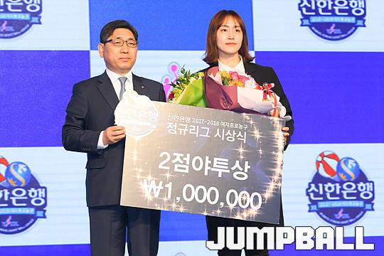 [점프볼=더케이호텔/유용우 기자] 2017-2018 여자프로농구(WKBL) 정규리그 시상식이 8일 서울 서초구 양재동 더케이호텔 그랜드볼룸에서 개최됐다. KEB하나 염윤아가 2점야투상을 수상하고 있다.