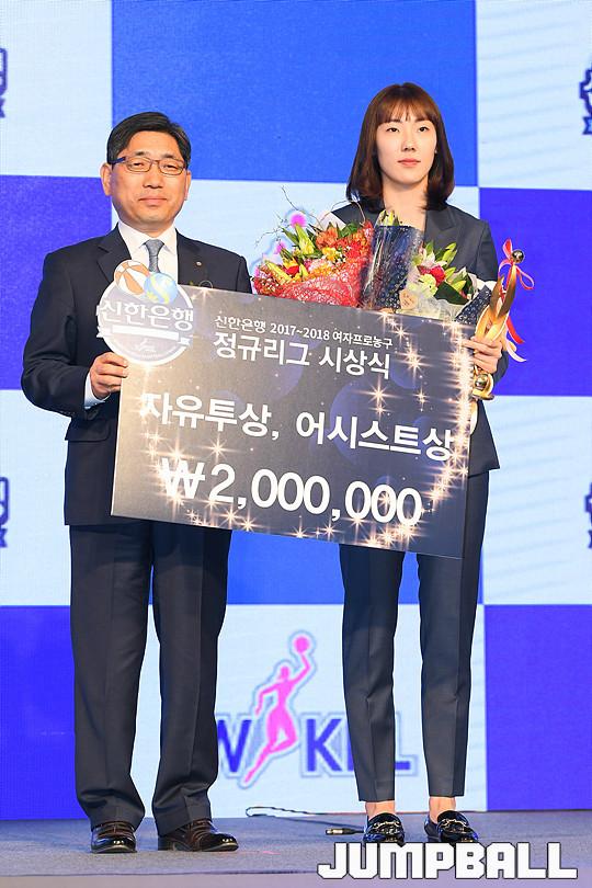 [점프볼=더케이호텔/유용우 기자] 2017-2018 여자프로농구(WKBL) 정규리그 시상식이 8일 서울 서초구 양재동 더케이호텔 그랜드볼룸에서 개최됐다. 우리은행 박혜진이 자유투상과 어시스트상을 수상하고 있다.