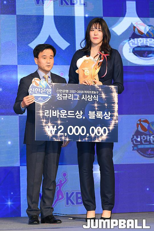 [점프볼=더케이호텔/유용우 기자] 2017-2018 여자프로농구(WKBL) 정규리그 시상식이 8일 서울 서초구 양재동 더케이호텔 그랜드볼룸에서 개최됐다. KB 박지수가 리바운드상과 블록상을 수상하고 있다.