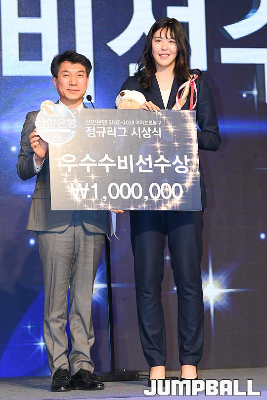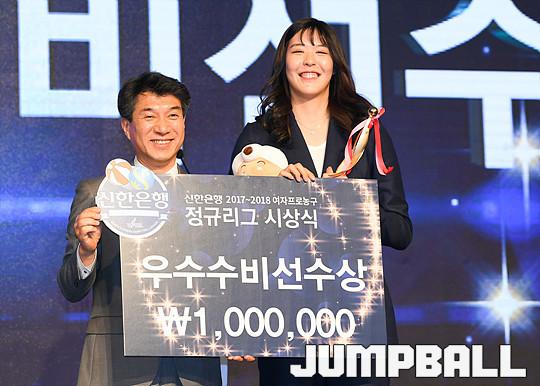 [점프볼=더케이호텔/유용우 기자] 2017-2018 여자프로농구(WKBL) 정규리그 시상식이 8일 서울 서초구 양재동 더케이호텔 그랜드볼룸에서 개최됐다. KB 박지수가 우수수비선수상을 수상하고 있다.