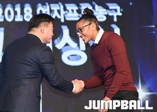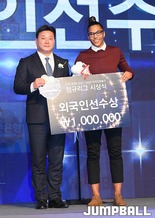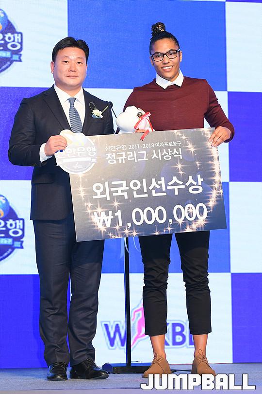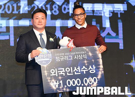 [점프볼=더케이호텔/유용우 기자] 2017-2018 여자프로농구(WKBL) 정규리그 시상식이 8일 서울 서초구 양재동 더케이호텔 그랜드볼룸에서 개최됐다. 삼성생명 토마스가 외국인선수상을 수상하고 있다.