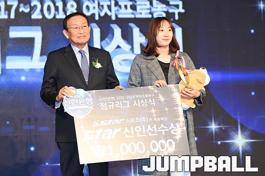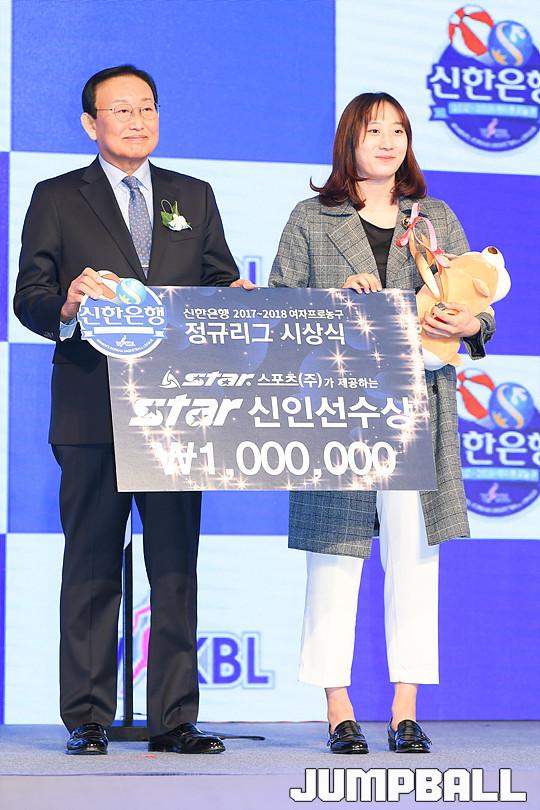 [점프볼=더케이호텔/유용우 기자] 2017-2018 여자프로농구(WKBL) 정규리그 시상식이 8일 서울 서초구 양재동 더케이호텔 그랜드볼룸에서 개최됐다. 삼성생명 이주연이 스타 신인선수상을 수상하고 있다.