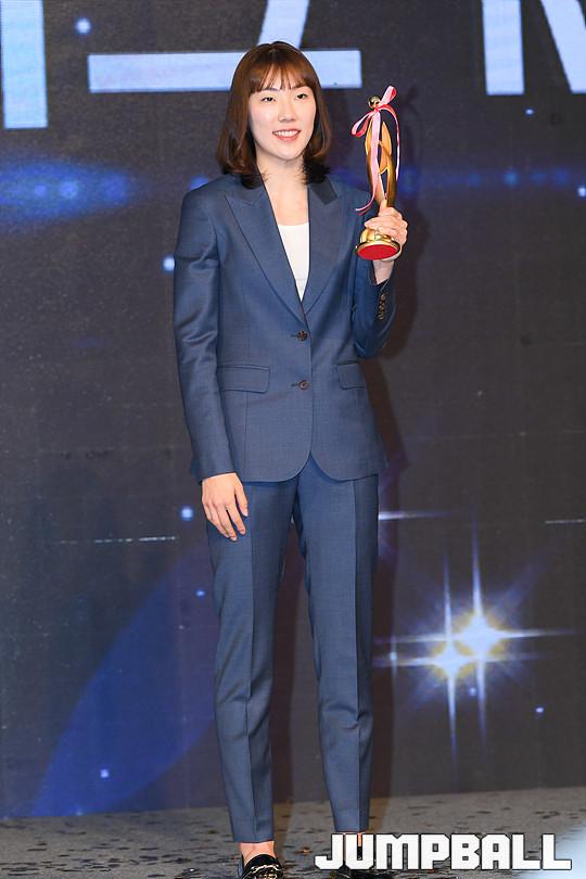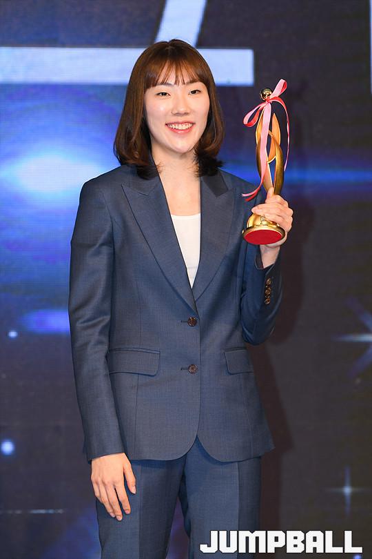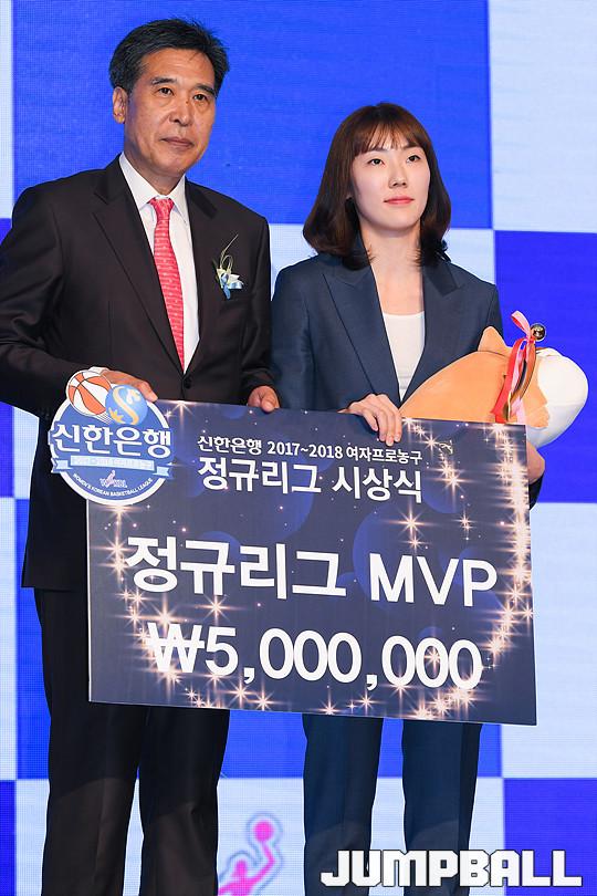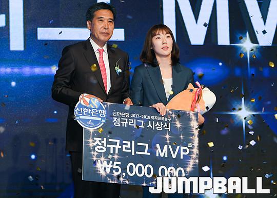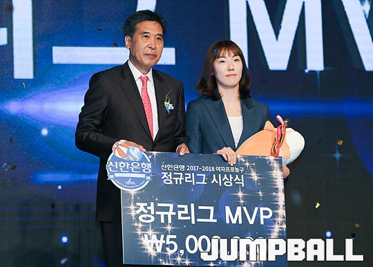 [점프볼=더케이호텔/유용우 기자] 2017-2018 여자프로농구(WKBL) 정규리그 시상식이 8일 서울 서초구 양재동 더케이호텔 그랜드볼룸에서 개최됐다. 우리은행 박혜진이 정규리그 MVP를 수상하고 있다.