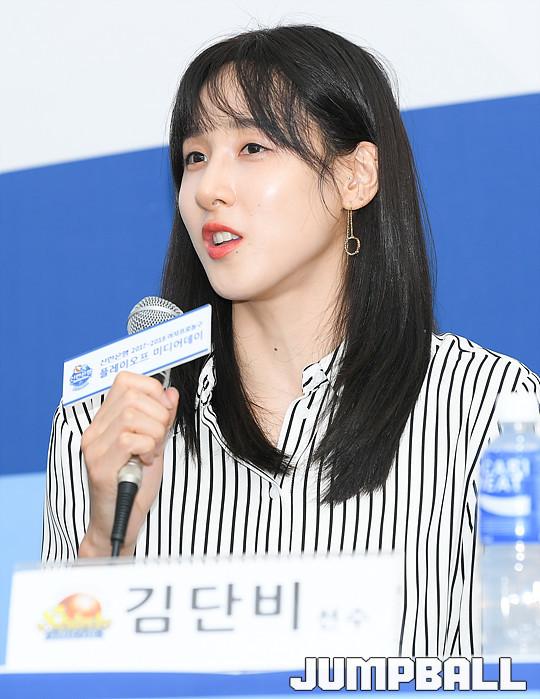 [점프볼=더케이호텔/유용우 기자] 8일 오후 서울 양재동 더케이호텔에서 진행된 ‘신한은행 2017-2018 여자프로농구’ 플레이오프 미디어데이에서 신한은행 김단비가 출사표를 던지고 있다.