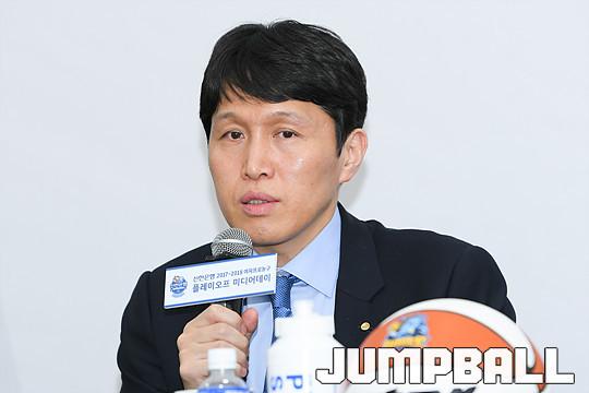 [점프볼=더케이호텔/유용우 기자] 8일 오후 서울 양재동 더케이호텔에서 진행된 ‘신한은행 2017-2018 여자프로농구’ 플레이오프 미디어데이에서 우리은행 위성우 감독이 출사표를 던지고 있다.