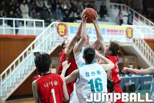 골밑에서 치열한 리바운드 다툼을 벌이는 양팀 선수들
