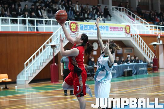 9일 광주대 실내체육관에서 개막된 2018 KUSF 대학농구U-리그 광주대와 용인대의 여대부 경기, 광주대의 새로운 야전사령관 홍채린이 수비를 뚫고 리버스 레이업슛을 시도하고 있다.