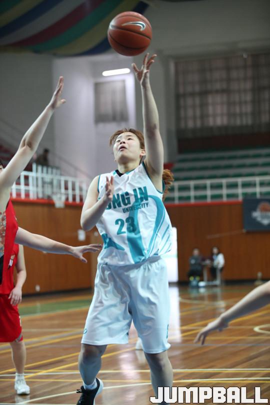수비를 피해 원핸드 슛을 던지는 용인대 조은정