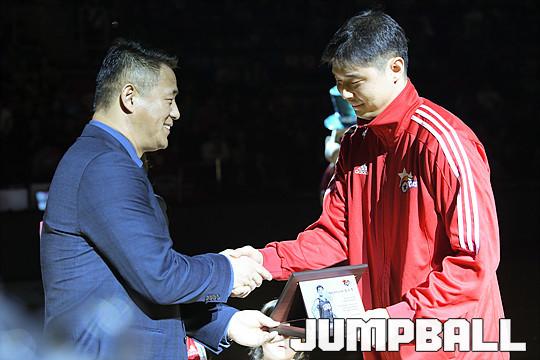추일승 감독과 허일영, 최진수가 기념패와 액자 그리고 15-16시즌 우승 세레머니가 인쇄된 기념 티켓을 액자에 담아 선물해 은퇴식을 빛내주었다.