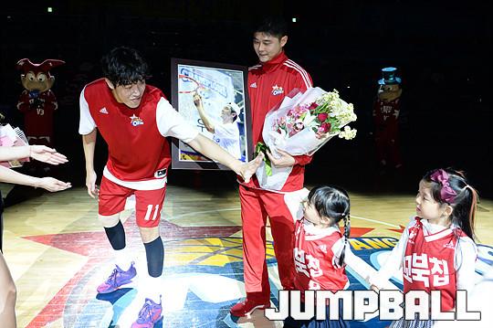 [점프볼=고양/유용우 기자] 10일 고양실내체육관에서 열린 '2017-2018 정관장 프로농구' 고양 오리온과 인천 전자랜드의 경기, 오리온 주장 김도수가 홈 경기 하프타임에 은퇴식을 가졌다. 김도수는 경희대를 졸업하고 2004-2005시즌 전자랜드에서 선수생활을 시작했다. 이날 김도수 선수의 아내와 딸들이 참석해 4880일의 선수생활 마지막을 함께 했다.