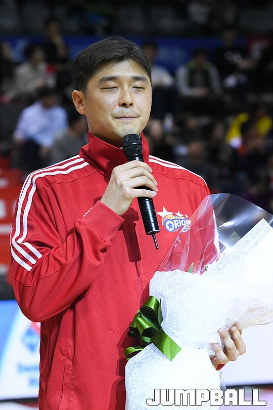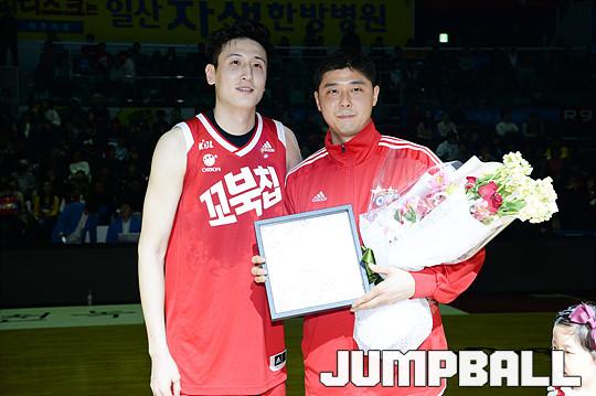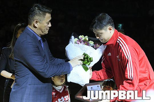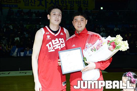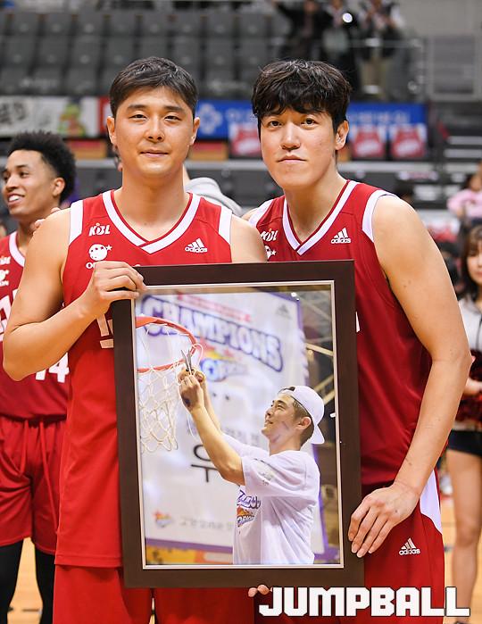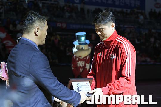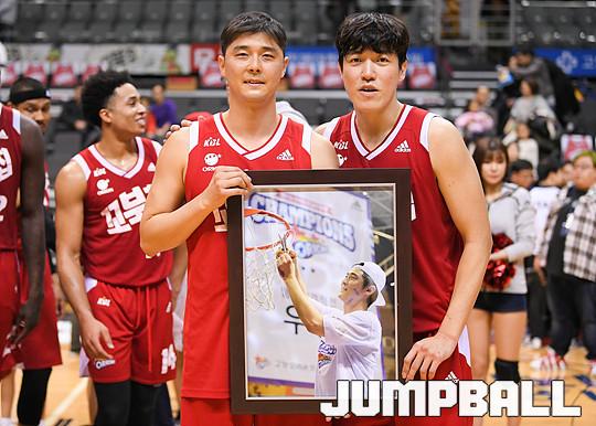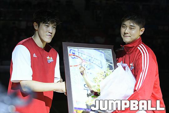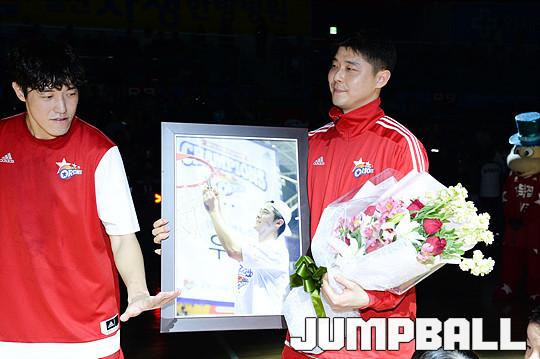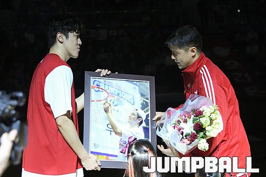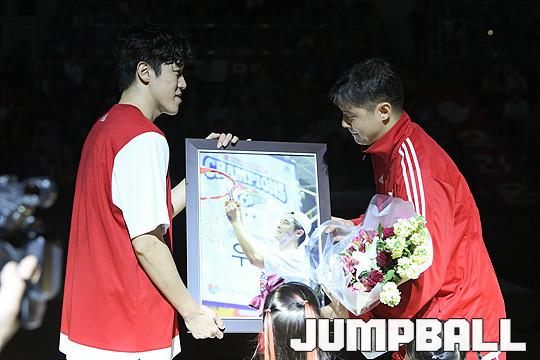추일승 감독과 허일영, 최진수가 기념패와 액자 그리고 15-16시즌 우승 세레머니가 인쇄된 기념 티켓을 액자에 담아 선물해 은퇴식을 빛내주었다.