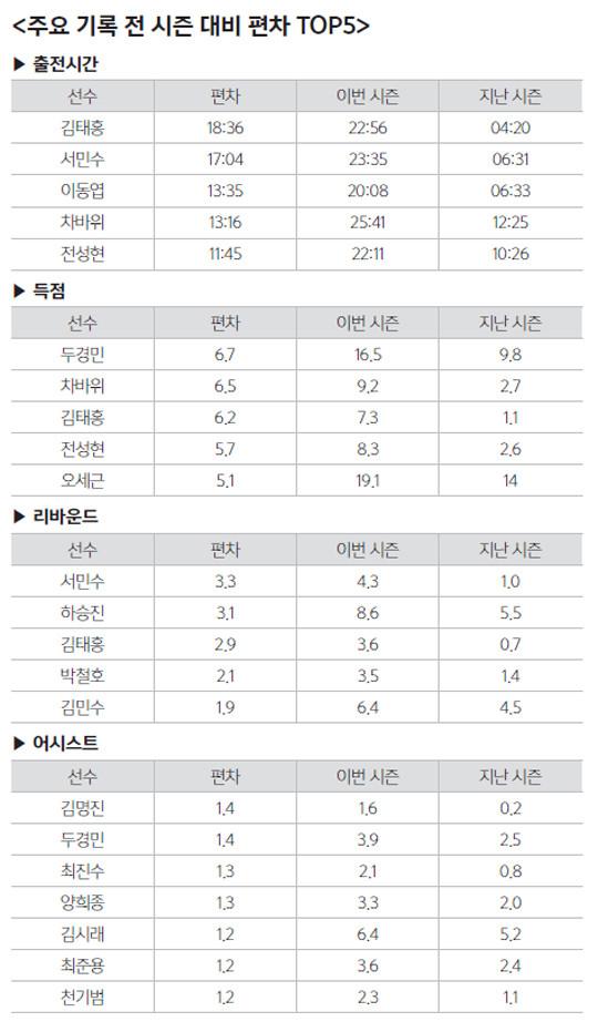 선수마다 출전시간 증감이 제각각이다. 40분 환산 기록으로 득점 편차를 살펴보면 여전히 송교창이 7.71점(14.81-7.10)으로 최고 자리를 지키고 있다. 2위는 강대협이 아닌 6.20점(14.13-7.93)인 이재도다. 강대협(5.75=14.70-8.95)과 이한권(4.56=16.23-11.67), 김동욱(4.45=15.05-10.60)이 그 뒤를 잇는다.