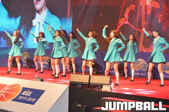 [점프볼=삼성동/홍기웅 기자] 14일 그랜드 인터컨티넨탈 파르나스 서울 그랜드볼룸에서 열린 '2017-2018 정관장 프로농구 시상식'. 여자 아이돌 그룹 프로미스나인이 축하공연을 하고 있다.