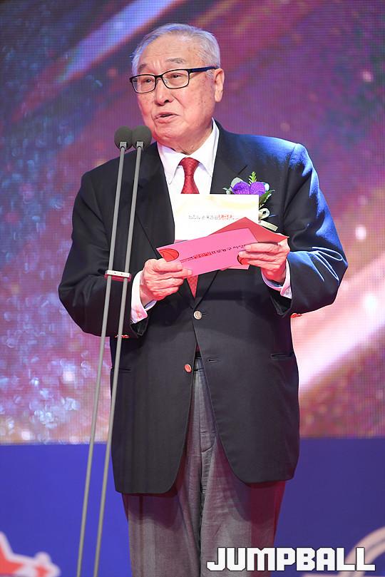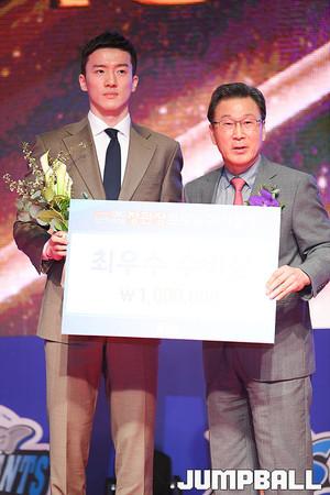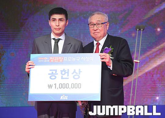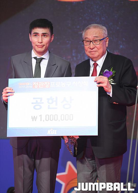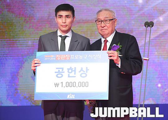 [점프볼=삼성동/유용우 기자] 14일 그랜드 인터컨티넨탈 파르나스 서울 그랜드볼룸에서 열린 '2017-2018 정관장 프로농구 시상식', 주희정이 KBL 김영기 총재에게 공로상을 받고 있다.