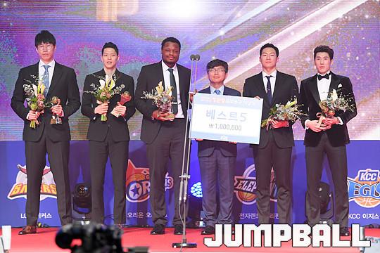 [점프볼=삼성동/유용우 기자] 14일 그랜드 인터컨티넨탈 파르나스 서울 그랜드볼룸에서 열린 '2017-2018 정관장 프로농구 시상식', 베스트5에 두경민 이정현 버튼 헤인즈 오세근이 선정됐다. 선수들이 수상 인터뷰와 사진촬영을 진행하고 있다.