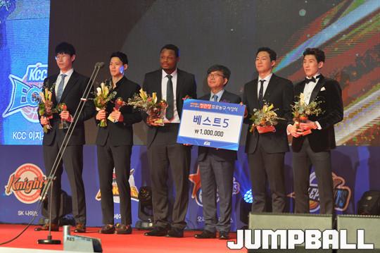 [점프볼=삼성동/홍기웅 기자] 14일 그랜드 인터컨티넨탈 파르나스 서울 그랜드볼룸에서 열린 '2017-2018 정관장 프로농구 시상식'. 두경민, 이정현, 디온테 버튼, 애런 헤인즈(김선형 대리수상), 오세근이 베스트 5에 선정돼 수상하고 있다.