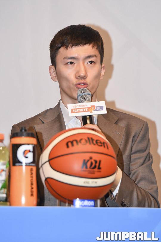 [점프볼=청담동/홍기웅 기자] 15일 서울 청담동 리베라 호텔 베르사유홀에서 열린 '2017-2018 정관장 프로농구 플레이오프 미디어데이'가 열렸다. 플레이오프에 진출한 6팀(DB, SK, KCC, 현대모비스, KGC, 전자랜드)의 감독과 선수가 참석해 미디어 인터뷰를 가졌다. 전자랜드 박찬희가 각오를 말하고 있다.