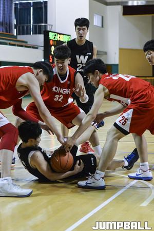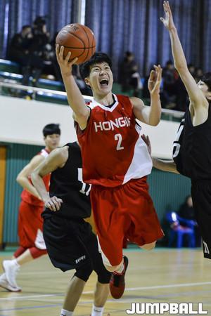 [점프볼=사천/홍기웅 기자] 20일 사천체육관에서 열린 '제55회 춘계 전국 남녀 중고 농구 연맹전' 홍익대사대부고와 휘문고의 경기. 휘문고 정희현이 골밑 슛을 던지고 있다.
