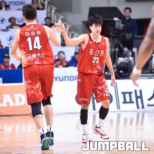 [점프볼=안양/윤희곤 기자] 23일 안양실내체육관에서 열린 ‘2017-2018 정관장 프로농구’ 안양 KGC와 울산 현대모비스의 6강 플레이오프 4차전 경기, KGC 전성현과 김승원이 하이파이브를 나누고 있다.