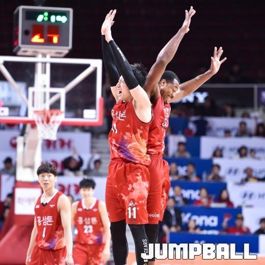 [점프볼=안양/윤희곤 기자] 23일 안양실내체육관에서 열린 ‘2017-2018 정관장 프로농구’ 안양 KGC와 울산 현대모비스의 6강 플레이오프 4차전 경기, KGC 양희종과 사이먼이 세리머니를 펼치고 있다.