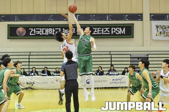[점프볼=충주/홍기웅 기자] 28일 건국대학교 글로컬캠퍼스 건국체육관에서 열린 '2018 KUSF 대학농구 U리그' 건국대와 동국대의 경기. 점프볼로 건국대와 동국대의 경기가 시작하고 있다.
