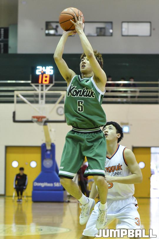 [점프볼=충주/홍기웅 기자] 28일 건국대학교 글로컬캠퍼스 건국체육관에서 열린 '2018 KUSF 대학농구 U리그' 건국대와 동국대의 경기. 건국대 최진광이 점프슛을 던지고 있다.