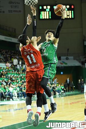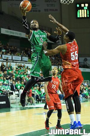 [점프볼=원주/유용우 기자] 28일 원주실내체육관에서 열린 '2017-2018 정관장 프로농구' 원주 DB와 안양 KGC인삼공사의 4강 플레이오프 1차전, DB 윤호영이 KGC 사이먼의 슛을 블록하고 있다.
