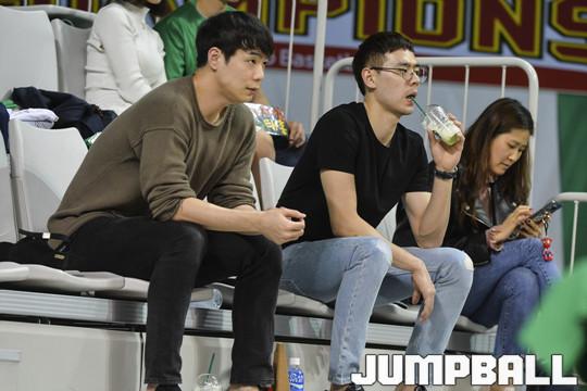 [점프볼=원주/홍기웅 기자] 30일 원주종합체육관에서 열린 '2017-2018 정관장 프로농구' 원주 DB와 안양 KGC의 4강 플레이오프 2차전 경기. 삼성 이관희와 현대모비스 이지원이 DB-KGC 경기를 관람하고 있다.