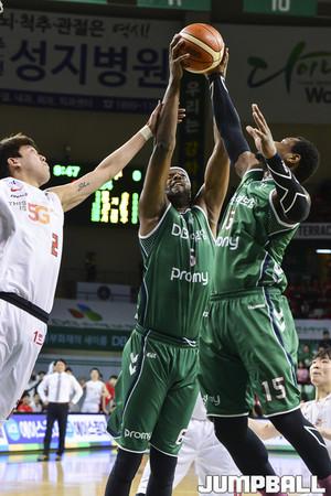 [점프볼=원주/홍기웅 기자] 8일 원주종합체육관에서 열린 '2017-2018 정관장 프로농구' 챔피언결정전 1차전 원주 DB와 서울 SK의 경기. DB 로드 벤슨과 디온테 버튼이 제임스 메이스를 더블팀으로 수비하면서 슛을 못던지게 하고 있다.