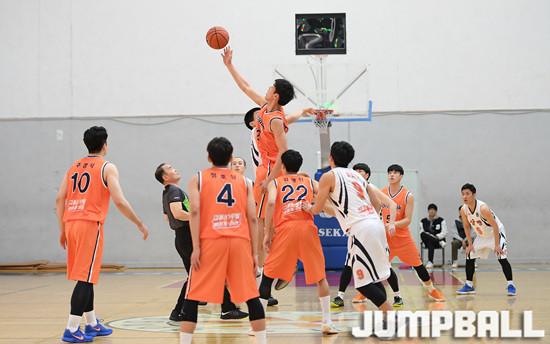 11일 동국대학교체육관에서 열린 '2018 KUSF 대학농구 U-리그' 동국대와 상명대의 경기, 동국대 조우성이 경시시작 점프볼을 다투고 있다.