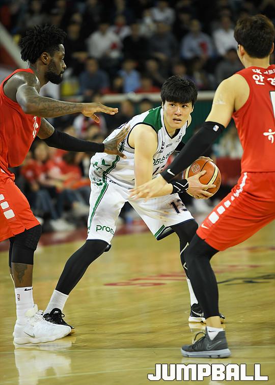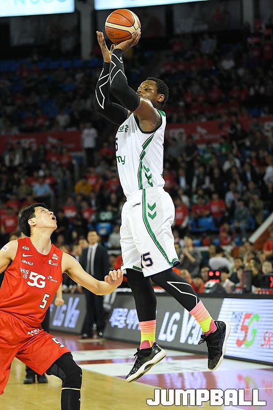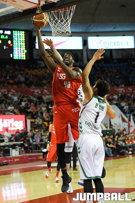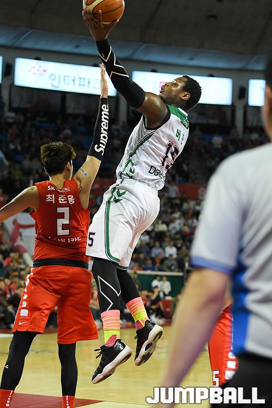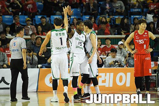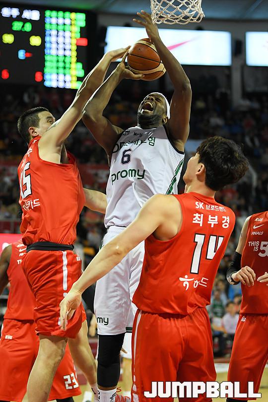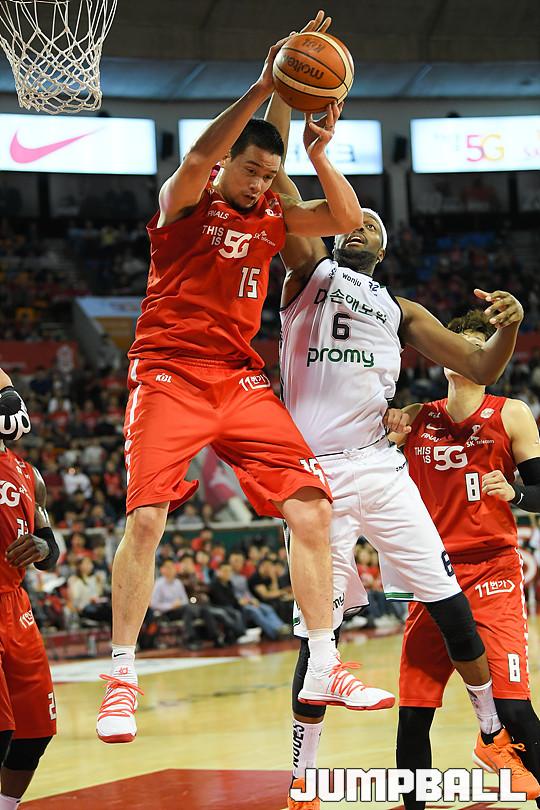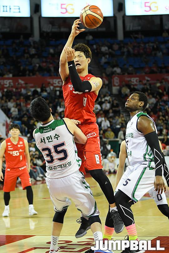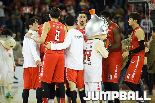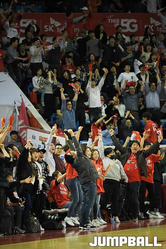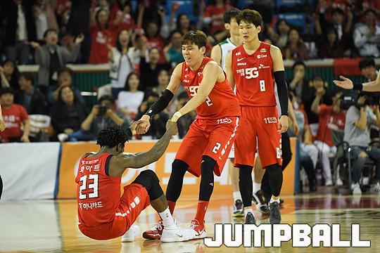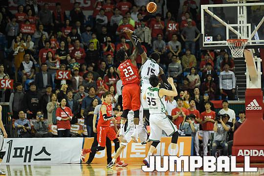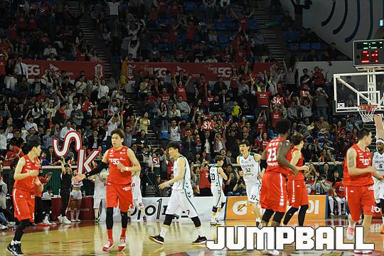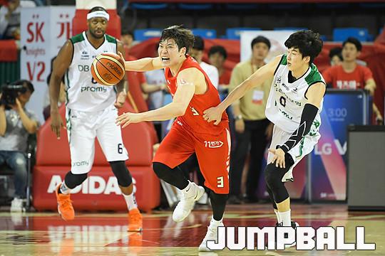 [점프볼=잠실학생/유용우 기자] 서울 SK는 12일 잠실학생체육관에서 열린 2017-2018 정관장 프로농구 원주 DB와의 챔피언결정전 3차전에서 101-99로 승리하였다. 2패 뒤 안은 1승이다. 전반한 때 20점차로 뒤졌지만, SK는 4쿼터 김선형과 화이트의 활약에 힘입어 역전에 성공했다.