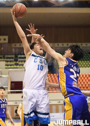 13일 한양대학교체육관에서 열린 '2018 KUSF 대학농구 U-리그' 남대부 한양대와 조선대의 경기, 조선대 신철민이 추격의 3점슛을 시도하고 있다.