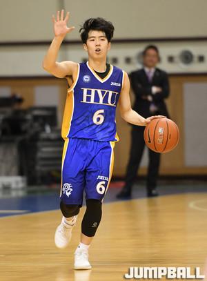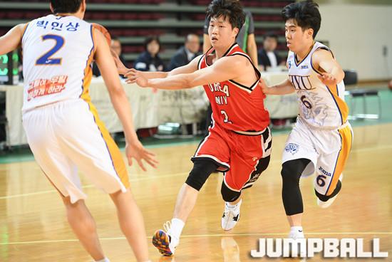 [점프볼=서울/문복주 기자] 30일 고려대 안암캠퍼스 화정체육관에서 열린 2018 KUSF 대학농구 U-리그 고려대와 한양대의 경기, 고려대 장태빈이 중앙을 파고들어 외곽으로 패스를 뿌리고 있다.