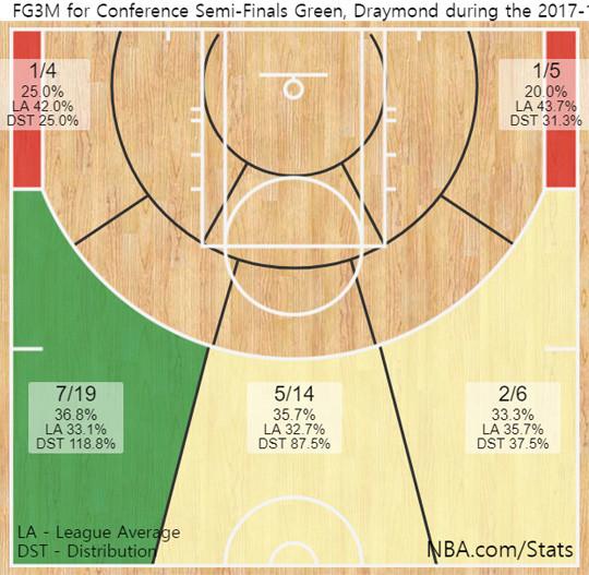 #2017-2018시즌 플레이오프 2라운드, 드레이먼드 그린 3점슛 성공률 분포도(*9일 기준)