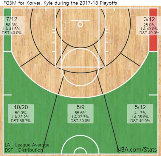 #2017-2018시즌 NBA PO 카일 코버, 3점슛 성공률 분포도(*12일 기준)