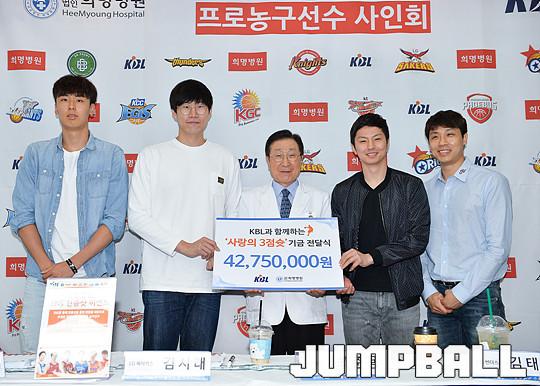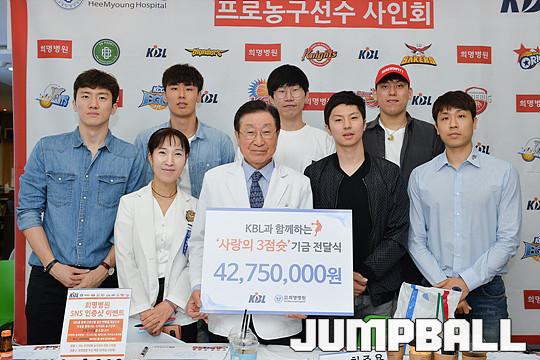 [점프볼=양지/유용우 기자] KBL 대표선수들이 사랑의 3점슛 기금 전달에 나섰다다. KBL(한국농구연맹)은 오는 17일 희명병원과 함께하는 '사랑의 3점슛' 캠페인 기금 전달식 및 KBL 주요선수 사인회를 희명병원(서울 금천구 소재)에서 진행하였다.