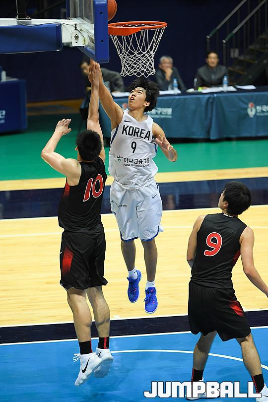 [점프볼=인천/유용우 기자] 18일 인천 도원체육관에서 열린 41회 이상백배 한일 대학농구 경기대회 1일차 남자부 경기, 한국대표팀 박지원이 레이업을 올리고 있다.