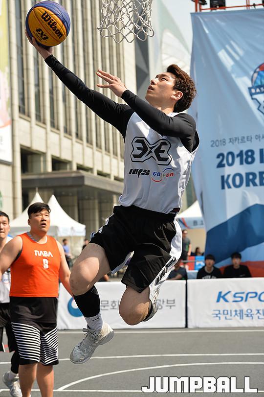 [점프볼=서울마당/유용우 기자] 26일 서울마당에서 열린 2018 KBA 3x3 코리아투어 서울대회 일반부, 아시아컵 대표팀 박민수가 골밑 공격을 시도하고 있다.