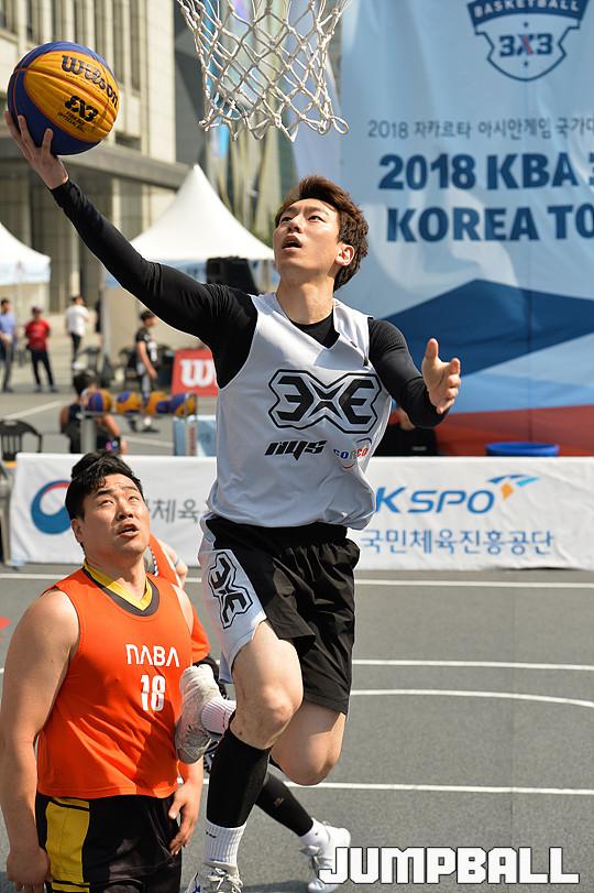 [점프볼=서울마당/유용우 기자] 26일 서울마당에서 열린 2018 KBA 3x3 코리아투어 서울대회 일반부, 아시아컵 대표팀 출신 박민수가 골밑 공격을 시도하고 있다.