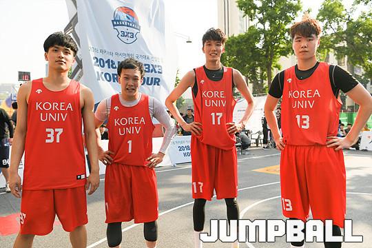[점프볼=서울마당/유용우 기자] 26일 서울마당에서 열린 2018 KBA 3x3 코리아투어 서울대회 오픈부 경기, 고려대 김호범, 박민우, 김준형, 김병수이 경기를 마치고 포즈를 취하고 있다.