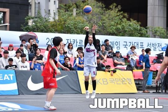 [점프볼=서울마당/윤희곤 기자] 27일 서울마당에서 열린 2018 KBA 3x3 코리아투어 서울대회 2일차 경기, WKBL 호프스 최규희가 상대 수비의 빈틈을 활용 2점슛을 시도하고 있다.