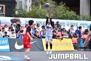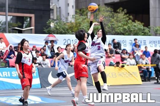 [점프볼=서울마당/윤희곤 기자] 27일 서울마당에서 열린 2018 KBA 3x3 코리아투어 서울대회 2일차 경기, WKBL 호프스 김진희가 상대 수비를 피해 점프슛을 시도하고 있다.